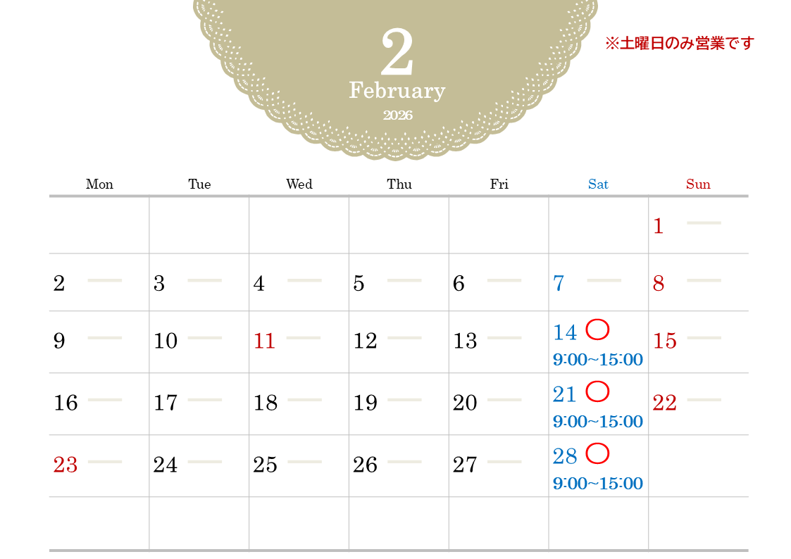 2月営業日のお知らせ お知らせ 2026.01.25 お知らせ 2月営業日 2月は土曜日のみの営業となります。 (14日・21日・28日) 【営業時間】9:00~15:00 ご予約は不要です。 順番にご案内いたしますので、 お気軽にお立ち寄りください。